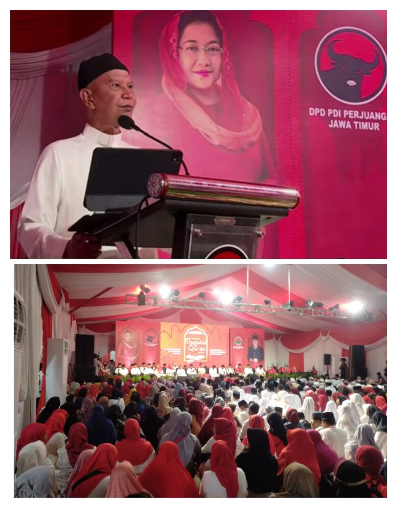 Surabaya – Dewan Pimpinan Daerah PDI Perjuangan Jawa Timur menggelar peringatan Nuzulul Qur’an 1447 H/2026 Kamis (5/3/2026). Ketua panitia sekaligus Wakil Ketua Bidang Keagamaan DPD PDI Perjuangan Jawa Timur KH. Abdul Wahab Yahya dalam sambutannya menyampaikan bahwa kegiatan tersebut menjadi bagian dari rangkaian program Ramadan yang diselenggarakan oleh DPD PDI Perjuangan Jatim. Ia berharap seluruh rangkaian kegiatan yang digelar selama bulan suci Ramadan dapat membawa keberkahan, kelancaran, serta diterima oleh Allah SWT. “Kami berharap seluruh aktivitas di bulan Ramadan ini diberikan keberkahan dan kelancaran oleh Allah SWT serta seluruh amal ibadah yang kita lakukan diterima,” ujarnya. KH Abdul Wahab Yahya menjelaskan, rangkaian kegiatan Ramadan di DPD PDI Perjuangan Jawa Timur telah dimulai sejak 20 Februari 2026 dengan berbagai kegiatan sosial dan keagamaan. Salah satunya pembagian takjil kepada masyarakat sebanyak kurang lebih 500 paket setiap hari. Selain itu, juga digelar kegiatan tadarus Al-Qur’an, salat tarawih berjamaah, serta kuliah tujuh menit (kultum) yang menghadirkan tokoh-tokoh dari berbagai organisasi dan perwakilan Badan Otonom Nahdlatul Ulama di Jawa Timur. Menurutnya, kegiatan tersebut diharapkan mampu memperkuat nilai religius sekaligus menghadirkan suasana yang harmonis di lingkungan partai yang dikenal berhaluan nasionalis. “Melalui kegiatan tadarus dan kultum ini kami berharap dapat memberikan nuansa religius sekaligus memperkuat semangat kebangsaan di lingkungan PDI Perjuangan,” katanya. Pada kesempatan tersebut, DPD PDI Perjuangan Jawa Timur juga memberikan santunan kepada sekitar 500 anak yatim, 50 janda, serta puluhan rekan media sebagai bagian dari kegiatan sosial Ramadan. Kegiatan ini disebut sebagai wujud kepedulian sosial sekaligus implementasi nilai keadilan sosial bagi seluruh rakyat Indonesia. Di akhir sambutannya, KH Abdul Wahab Yahya juga menyampaikan permohonan maaf apabila dalam pelaksanaan kegiatan masih terdapat kekurangan, serta berharap seluruh rangkaian acara Ramadan yang digelar dapat berjalan dengan lancar hingga akhir. “Semoga seluruh kegiatan yang kami selenggarakan ini dapat memberikan manfaat bagi masyarakat dan menjadi ladang kebaikan bagi kita semua,” pungkasnya. Sementara itu, Ketua DPD PDI Perjuangan Jawa Timur MH. Said Abdullah dalam kesempatannya menyampaikan bahwa kegiatan keagamaan seperti peringatan Nuzulul Qur’an merupakan bagian dari tradisi yang terus dijaga oleh PDI Perjuangan dalam menghormati keberagaman agama di Indonesia. Menurutnya, setiap perayaan keagamaan, baik Islam, Kristen, Katolik maupun agama lainnya selalu mendapat perhatian dan partisipasi dari kader partai. “Setiap ada perayaan keagamaan besar, baik itu Natal maupun kegiatan keagamaan lainnya, kami selalu hadir bersama. Begitu pula dalam tradisi Islam, karena sedang bulan Ramadan, maka kami mengadakan peringatan Nuzulul Qur’an,” ujarnya. Ia menambahkan, kegiatan tersebut tidak hanya bertujuan memperkuat nilai keagamaan di internal partai, tetapi juga sebagai bentuk kepedulian sosial kepada masyarakat. Selain kegiatan keagamaan, PDI Perjuangan Jawa Timur juga menyalurkan bantuan sosial kepada masyarakat selama bulan Ramadan. Said Abdullah menyebutkan bahwa sejak awal Ramadan telah disalurkan ratusan ribu paket sembako kepada masyarakat di berbagai daerah di Jawa Timur. “Mulai awal Ramadan kemarin kami sudah menyalurkan sekitar 360 ribu paket sembako yang berisi beras, minyak goreng, dan gula kepada masyarakat di Jawa Timur,” jelasnya. Said Abdullah juga menegaskan bahwa kegiatan sosial dan keagamaan tersebut merupakan bagian dari komitmen PDI Perjuangan untuk terus hadir di tengah masyarakat serta menghidupkan nilai-nilai kebersamaan dan kemanusiaan.